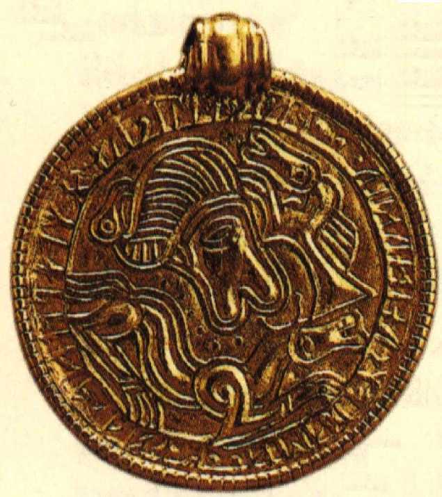 The most interesting of the Tjurkö bracteates is an item (Tjurkö Bracteate I) currently on display in the "Gold Room" of Statens Historiska Museum in Stockholm. Tjurkö Bracteate I has a runic inscription with 37 clear and unambiguous runes, written from right to left, as is the practice in many Semitic scripts.