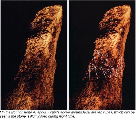 The 8th and 9th lines then, with 10 runes in all are on the approximate eighth level between 7 and 7.7 cubits above the ground level, on the front of stone A: