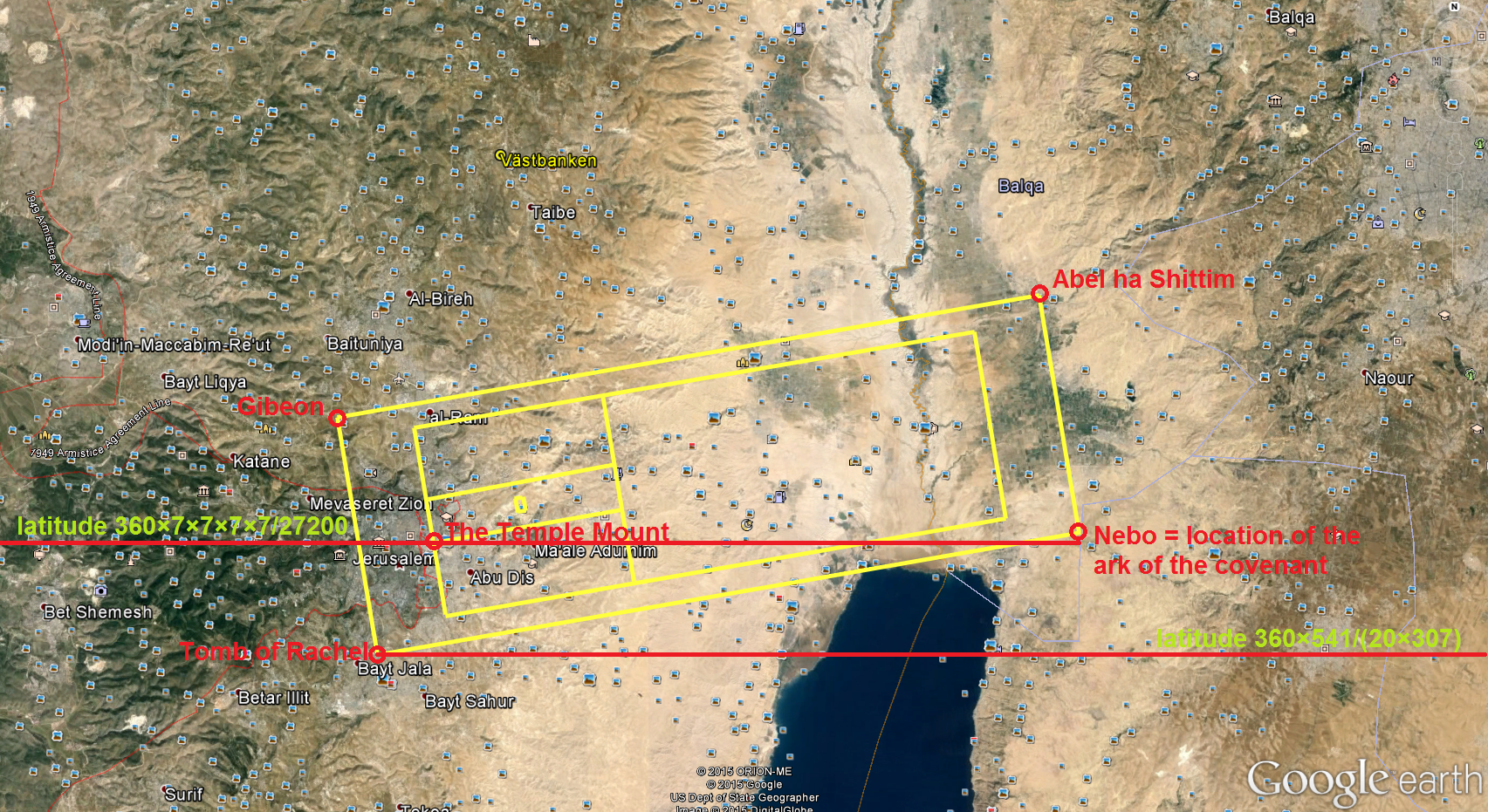 The temple of Solomon was most likely located on the same site as the present Dome of the Rock. The latitude 360×7×7×7×7/27200 runs through this site.